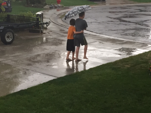 We've had some really rainy days. It is always fun to play, barefoot in the puddles, and to float home-made boats in the gutter. Even when your Grandmother only has a flowery umbrella.